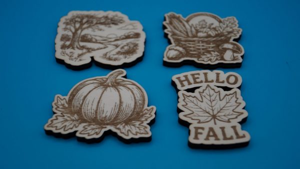 Celebrate the cozy fall season with these wooden magnets. With engraved pumpkins, autumn leaves, and rustic harvest motifs.